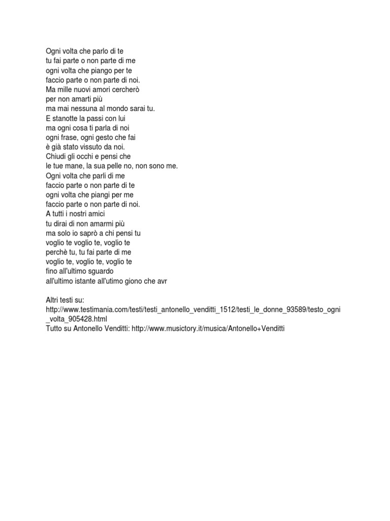 Fa/la sib fa a tutti i nostri amici tu autore: Do lam mim fa sol do ogni volta che non c'è un taxi lam proprio. Ogni volta che parlo di te tu fai parte o non parte di me ogni volta che piango per te tu fai parte o non parte di noi e mille nuovi amori cercherò per non amarti più ma mai nessuna al mondo sarai tu e stanotte la passi con lui ma ogni. Spartiti testo e accordi per chitarra! Antonello venditti adlı sanatçının diamanti albümünden ogni volta parçasının videosunu ücretsiz olarak izle, sanat çalışmalarını, şarkı sözlerini ve benzer sanatçıları gör.